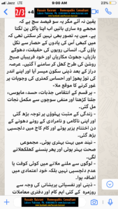 – عشق، جنون کی حقیقت بودی اور بے معنی لگنے لگی۔ ایک دو بار تو ایسے بھی ہوا کہ مجھے اپنے اُس محبوب کا نام بھی بھول گیا کہ جس سے رابطہ کے بغیر ایک دن گزارنا بھی ناممکن لگتا تھا۔ کسی دن اگر فون یا میسیج نہ آتا تو رات کو نیند مشکل تھی۔ آپ کو شاید یقین نہ آئے مگر یہ سو فیصد سچ ہے کہ مجھے وہ ساری باتیں اب اپنا پاگل پن لگتا ہے۔ میں یہ تصور بھی نہیں کر سکتی تھی کہ میں کبھی اُس کی یادوں کے حصار سے نکل پاؤں گی۔ انسانی رویوں کی حقیقت، دھوکے بازیاں، جھوٹ مکاریاں اور خود فریبیاں صبحِ روشن کی طرح کھل کر سامنے آ گئیں۔ عرصہ دراز کے بعد ذہنی سکون میسر آیا اور اپنے اندر کی توڑ پھوڑ اور احساسِ کمتری کی وجوہات پر غور کرنے کا موقع ملا-