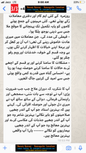 – مشکلات کا سامنا کرنے اور ہر قسم کے اچھے بُرے حالات کا سامنا کرنے حوصلہ پیدا ہو رہا ہے- احساسِ گناہ میں قدرے کمی واقع ہوئی جس سے امید کی کرنیں جاگ اٹھیں۔آپ کا شکریہ کہ دورانِ علاج جب جب ضرورت پڑی؛ آپ نے توجہ سے بات سُنی، سمجھی اور راہنمائی فرمائی۔ دوائی کے ساتھ ساتھ آپ نے میری دل جوئی اور حوصلہ افزائی کی۔ کہتے ہیں کہ بہترین استاد جو آپ کے اندر چھپی صلاحیتوں کو باہر نکالے؛ بہترین شاعر وہ جو آپ کے اندر چھپے جذبات کی عکاسی کرے اور بہترین معالج وہ جو آپ کے اندر چھپی بیماریوں کو نکالے —— ہاں! آپ واقعی بہترین معالج ہیں۔ ——————-محترمہ کو اِن تکالیف کے لئے ہومیوپیتھک دوا فاسفورک ایسڈ (Phosphoric Acid) دی گئی تھی۔حسین قیصرانی – ہومیوپیتھک کنسلٹنٹ – لاہور پاکستان فون نمبر 03002000210۔