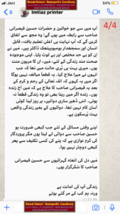 آپ میں سے جو خواتین و حضرات حسین قیصرانی صاحب سے رابطہ میں ہوں گے؛ وہ مجھ سے اتفاق کریں گے کہ آپ نہایت ہی اعلیٰ تعلیم یافتہ، قابل انسان اور سمجھدار ہومیوپیتھک ڈاکٹر ہیں۔ مَیں نے اِن کو بے حد مخلص اور بے لوث پایا۔ اپنی موجودہ صحت مند زندگی کے لئے، مَیں، ان کا مرہونِ منت ہوں۔ میری بہت ہی بُری حالت میں تھا کہ جب انہوں نے میرا علاج کیا۔ یہ قطعاً مبالغہ نہیں ہوگا اگر میں یہ کہوں کہ اللہ تعالیٰ کے رحم و کرم کے بعد یہ قیصرانی صاحب کا علاج ہے کہ مَیں آج زندہ ہوں۔ زندہ اگر میں رہتا بھی تو وہ زندگی قطعاً نہ ہوتی۔ اتنی ڈھیر ساری دوائیں، ہر روز لینا کوئی آسان کام نہیں تھا۔ دوائیوں کے بغیر زندگی واقعی بہت پُرسکون ہے۔